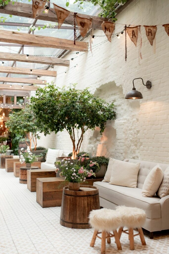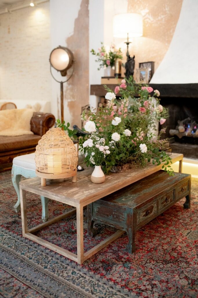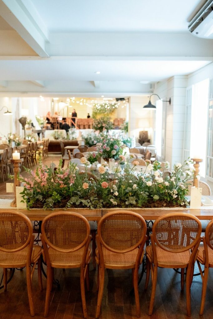 No farm style, a mesa não é apenas um lugar onde se come, é o epicentro de conversas, risos e lembranças. Mesas longas, comunitárias, permitem que os convidados se conectem mais facilmente. Combine isso com bancos de madeira, cadeiras variadas, tecidos naturais e caminhos de mesa com folhagens soltas em harmonia com cores terrosas.
